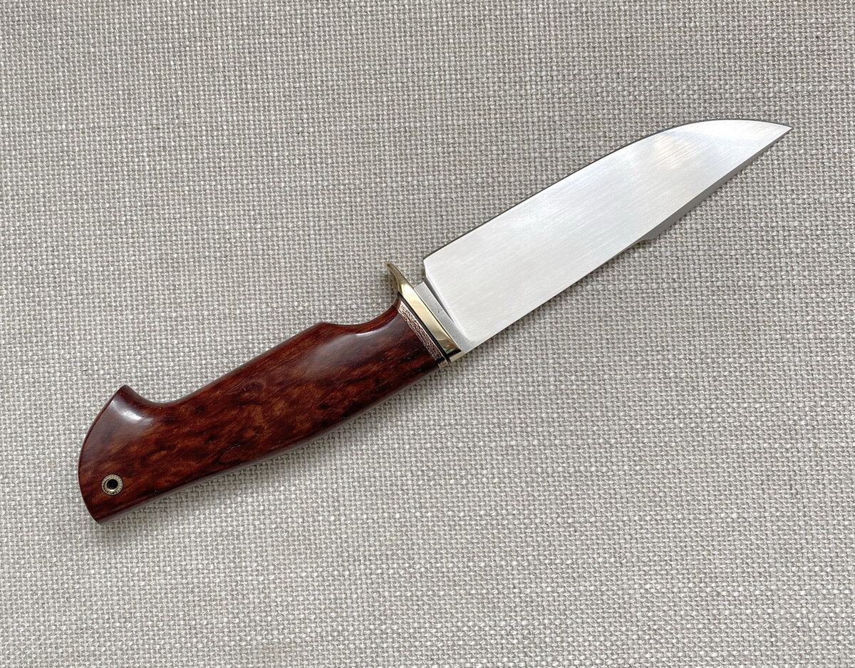 Клинок из M398 135*4*32мм, ручной сатин. Рукоять обалденный стабилизированный кап бубинги, производства Сергея Гринина. По мотивам американских мини-боуи. 09.2021 г.
