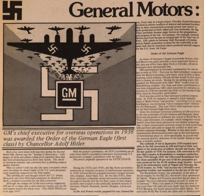 Но как вы можете заметить, в тексте мелькают сплошь американские компании, а не английские. Тема того, что Гитлера надо было сплавить на Восток и натравить на СССР - это европейская тема. Американцам было все равно, по большому счету, с кем подерется Германия, хоть бы и с бывшей метрополией. Они-то рассчитывали, что потом на это пепелище все равно придут они. Американские банки и промышленные корпорации продолжали активно сотрудничать с гитлеровцами даже во время Второй мировой. Заводы Форда поставляли авиадвигатели и бронеавтомобили, они произвели треть всех немецких военных грузовиков, IBM - сортировочные машины для концлагерей, счетные машины и перфокарты, а «Кока-кола» выпускала на заводе в Германии «Фанту». Не напрямую, через акционерные связи. В обмен на поддержку нацистов крупные промышленные предприятия получали госзаказы на военную технику (пушки, танки, самолеты, бронеавтомобили), а также боеприпасы, отравляющие газы и печи для крематориев концлагерей. Кстати, позже по этому поводу в США были суды, которые жертвы нацизма выиграли.
