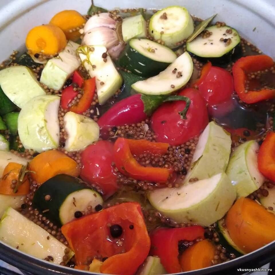 Приготовьте овощи по этому рецепту и получите прекрасную закуску уже на следующий день. А через неделю ваши близкие будут просить вас повторить шедевр ещё и ещё раз. Возьмите разные овощи - у меня были огурцы, кабачки, цукини, болгарский перец, острый перец, морковь, лук, чеснок. Сюда же хорошо пойдут помидоры, капуста, сельдерей.