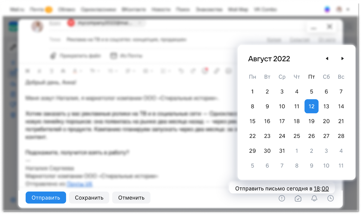 Во многих почтовых сервисах можно сделать отложенную отправку письма. Достаточно выбрать дату и время — письмо придет в удобный для получателя рабочий день