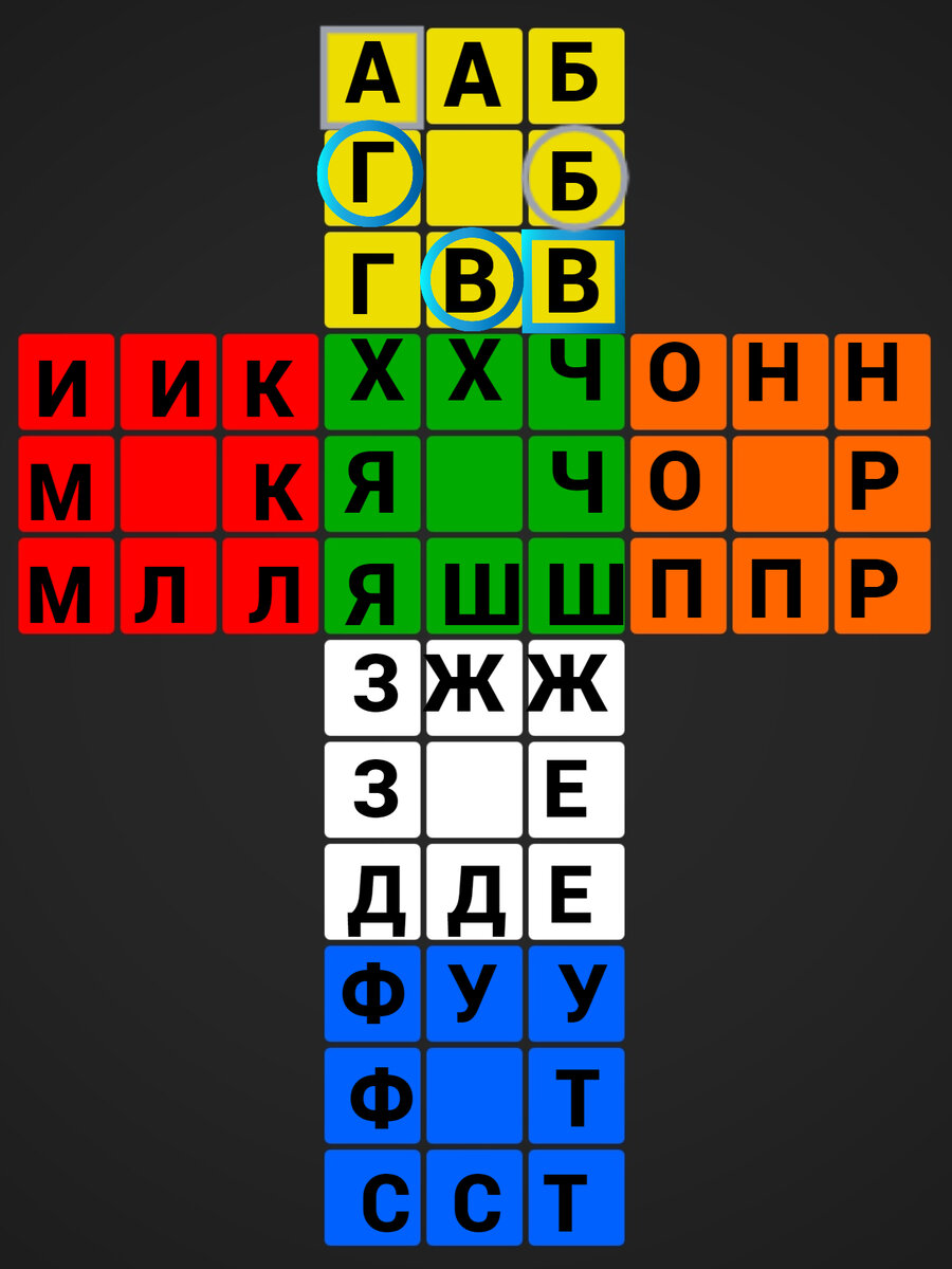 Если бы мы собирали кубик сразу, то в буфере появилась бы буква, стоящая раньше на месте буквы "Д", но раз этих действий мы пока не совершили, мы смотрим на букву, стоящую на месте "Д". Там оказывается "Х". Сразу составляем слово ДуХи