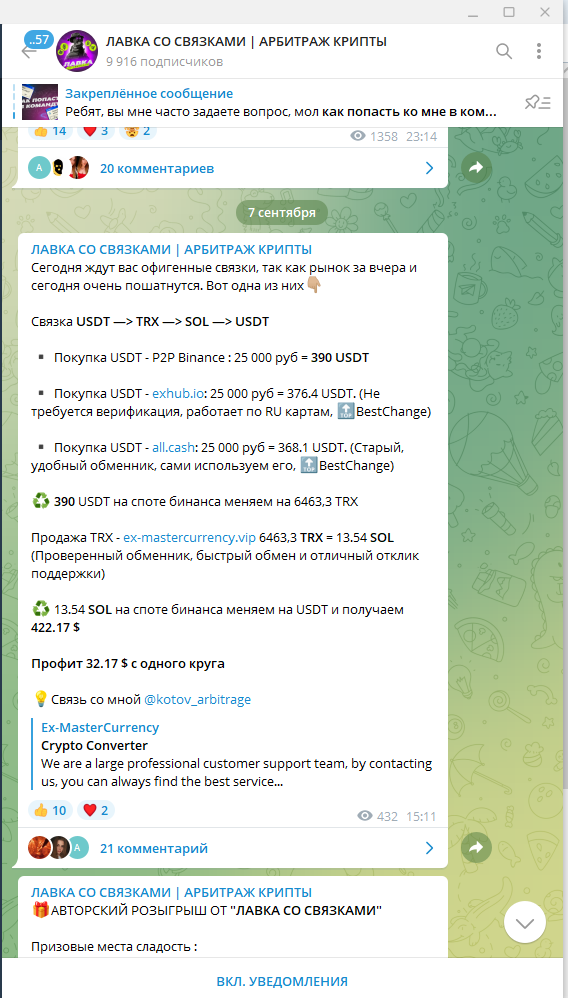 Всем привет! Расскажу вам свою историю, чтобы предостеречь вас. В телеграме много каналов, которые предлагают арбитражные связки. И к сожалению малое количество каналов , которые по-настоящему достойны внимания, но сейчас не об этом. Мы поговорим про те каналы , которые плодятся как кролики , чтоб обманывать вас на начальном этапе. Начнем... Вкратце, что они предлагают вам ,вы переводите крипту с кошелка на этот же кошелёк в другой валюте , используя сторонний сервис . Делаете круг своего банка. Зарабатывая на разнице котировок между обменниками ) Все звучит очень легко и просто, на связку вы тратите примерно мин 30. О таком даже и мечтать нельзя было )Но хочу сразу вас предостеречь: 1. Пример связок , которые они предоставляют очень уж сказочно просто , не бывает так в жизни . Арбитраж криптовалюты ,занимает намного больше времени и ресурсов. 2. Очень много групп в телеграмме , которые не честным трудом хотят заработать деньги, обещая вам что с помощью их рекомендаций вы будете зар