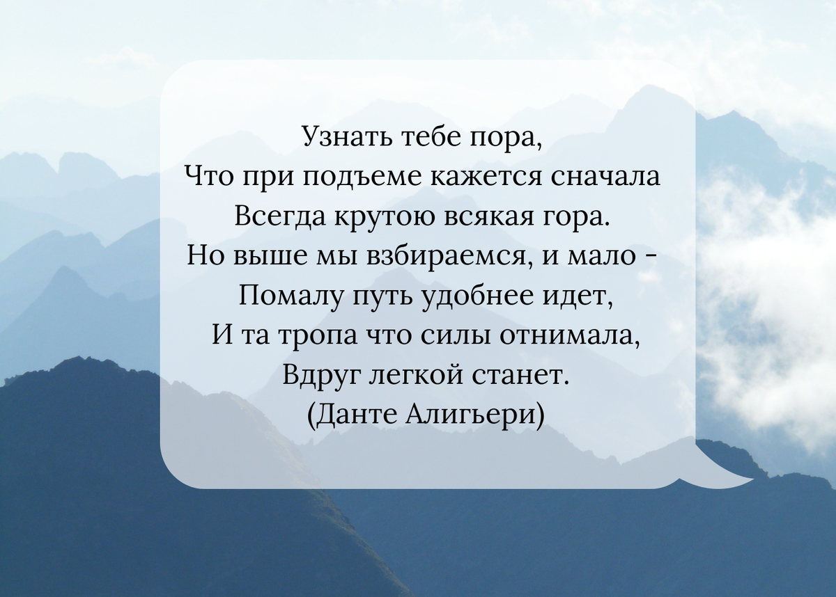 Случайно увидела эту фразу на просторах сети. Думала, что-то японское. А вот и нет. Оказывается, это "Божественная комедия" Данте. Кстати, как филолог, не удержусь и скажу, что комедией сие великое произведение названо не потому, что Данте был шутником и затейником, а потому, что по литературным канонам того времени произведение с успешным началом и устрашающим концом, написанное на латинском языке считалось трагедией. Произведение с успешным концом и трагичным началом, написанное на языке простонародном (в данном случае итальянском), считалось комедией. Кстати, слово "божественная" тоже не Данте придумал.. Но не в этом суть. И в горах, и в жизни надо напоминать себе, что подъем отбирает силы не для того, чтобы сделать нас слабее. Он берет их, чтобы впоследствии приумножить и показать, сколь многое мы можем, если решимся идти.