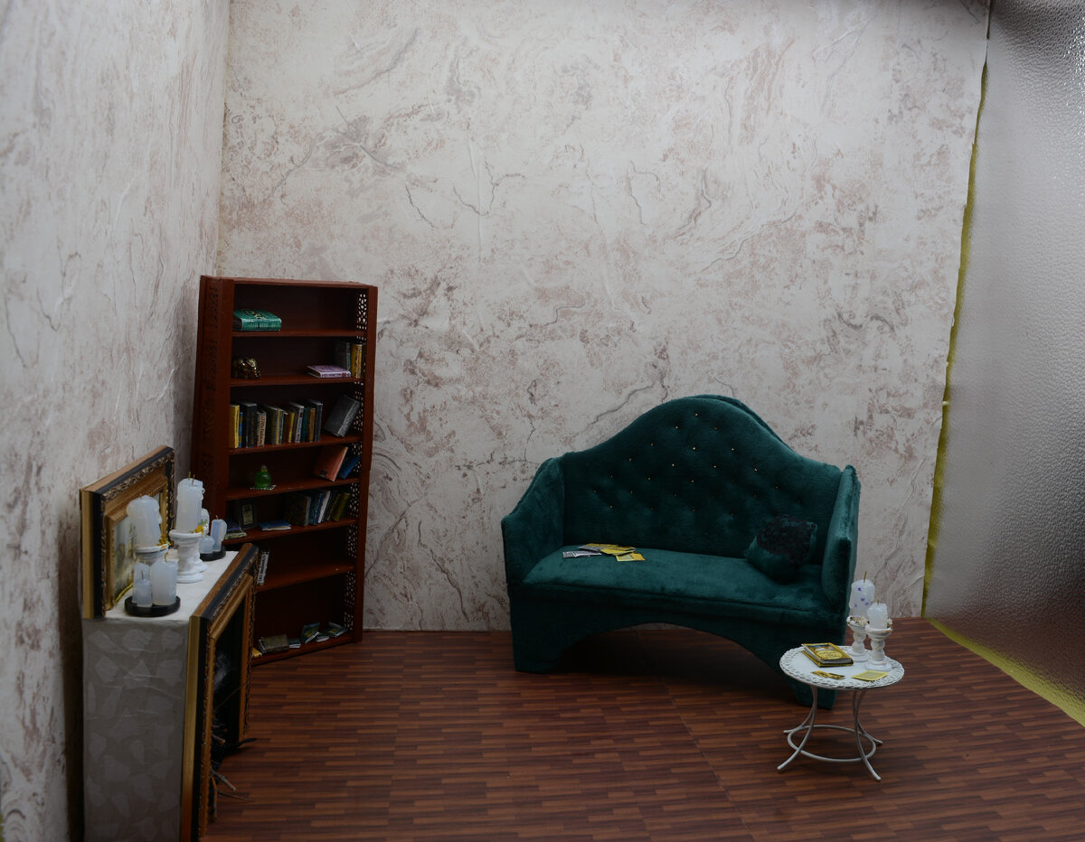 Я счастливый человек! Вот такой подарок я получила на свой день рождения — моя сестра своими руками сделала для меня румбокс. И не просто сделала — прям влилась в эту деятельность на несколько месяцев. С учётом, что у неё двухлетний ребёнок, рутина и работа) Это фантастика! Я уже давно подумываю делать такие комнаты, даже список написала, какие именно мне нужны. Но начну со следующего года — на остаток этого тоже немало планов. А теперь перейдём к обзору потрясающего румбокса. Он состоит из пола и двух стен. Из мебели — камин (или печка?), диван, стеллаж с книгами и столик, который добавила уже я. Ещё был ковёр и зеркало, которые я пока убрала. В зеркале отражаюсь я, и меня это раздражает) А ковёр в комнате с камином мне кажется неуместным. С наполнением камина ещё буду работать. Пока не могу придумать, как имитировать золу и сажу. Положила кусочки чёрной ткани с бело-серыми вкраплениями, но решение так себе. И "наломала" дров побольше. Стеллаж был сделан из веера с резьбой! И книги