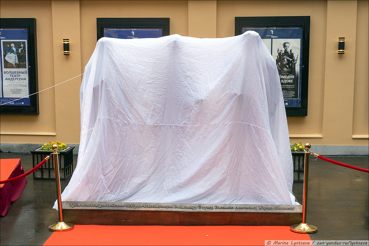 Все трое были актерами Театра Вахтангова и памятник расположился перед входом Симоновской сцены во внутреннем дворе театра (Калошин переулок).