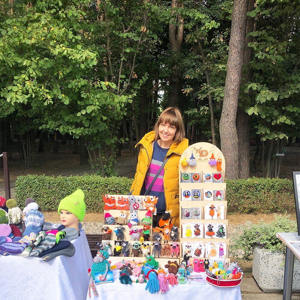 Добрый день. В воскресенье был хоть и прохладный, но солнечный день, который я провела на маркете ручной работы в Лазутинке. Как всегда море положительных эмоций и заряд но новые творческие подвиги))). Вот небольшой фотоотчет, и начну я со своих работ. Мои новые шерстяные броши с рисунками. Кстати, на моих занятиях, которые начнутся 14 сентября, мы будем много рисовать шерстью, создавать авторские штучки (броши, кулоны, серьги и так далее). Фетровые овечки из коллекции "Осень". Валяные и вязаные брелоки. В центральной части игрушки, сделанные в технике обмотки (лиса, ёжики, овечки). Вообще атмосфера этого парка всегда энергичная и бодрая. Поскольку парк имеет статут спортивного, здесь всегда проходит много танцевальных мероприятий, забегов и прочих соревнований. В это воскресенье был арбузный забег! Начну рассказ о других мастерах со своих "соседок". Теплые шапочки, повязки для волос и перчатки ручной работы от Ксении Паниной. Изделия из эпоксидной смолы, картины. Мастер-классы для д