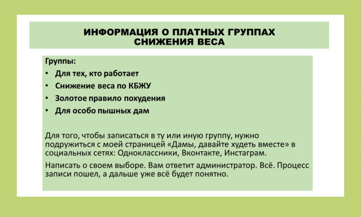 - Вроде уже не хотела такую новую группу собирать, администраторы объявили об этом в группе, но последовал ТАКОЙ шквал обращений, что ТАК КОМФОРТНО в этой группе худеть, ТАК УДОБНО, результаты хорошие - не закрывайте! Уступила, вновь объявили набор и я уже опять об этом жалею. Психологически некомфортно в этой группе работать: те, кто в ней сейчас, понимают о чем я. В общем, поживём, увидим.