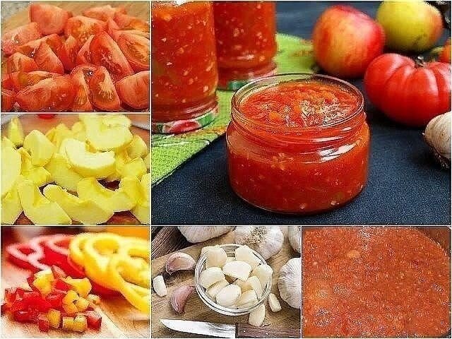 Очень вкусная аджика, готовлю её каждый год в большом количестве. Ингредиенты: - 2 кг помидоров, - 1 кг болгарского перца, - 500 г моркови, - 500 г яблок, - 200 г чеснока, - 3 стручка острого перца (рекомендую брать по вкусу) - 250 мл растительного масла, - соль и черный молотый перец по вкусу. Приготовление: 1. Яблоки почистить, удалить сердцевину и порезать дольками. 2. Морковь помыть и почистить. Порезать кусочками что бы легче было перекрутить. 3. Помидоры помыть и порезать дольками. 4. Болгарский перец помыть, удалить зерна и плодоножки. 5. Острый перец порезать кусочками. Чеснок почистить. 6. Перекрутить всё при помощи блендера или мясорубки. 7. Перекрученные овощи выложить в емкость для варки. Добавить соль, перец и растительное масло. 8. Варить аджику в течении 2,5 часов, периодически помешивая. 9. Разлить аджику по стерилизованным банкам и закупорить. Приятного аппетита!