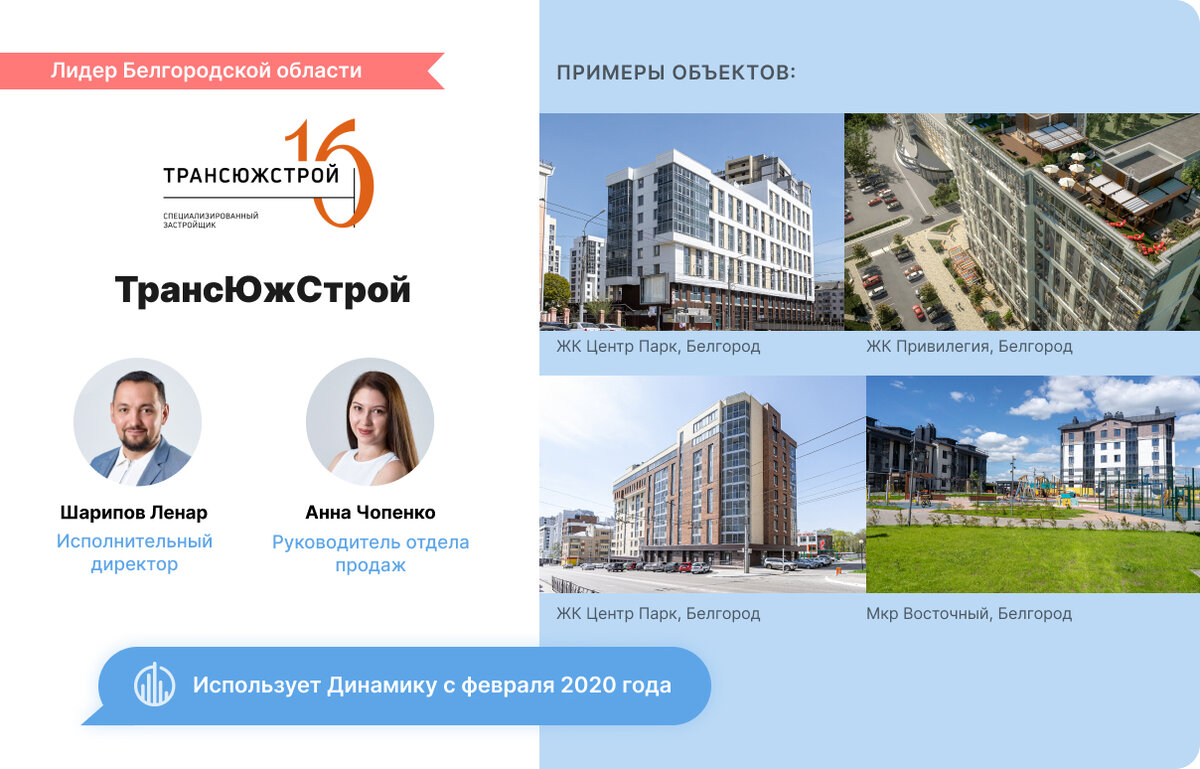 Компания Трансюжстрой – лидер в Белгородской области. Начали сотрудничать в феврале 2020 года. На тот момент мы организовывали отделы продаж для застройщиков. Ленар Рашидович, исполнительный директор Трансюжстроя, тогда только вступил в должность. Он наблюдал, как мы продавали квартиры у другого девелопера и сел с нами за стол переговоров, чтобы узнать, как мы это делаем.
