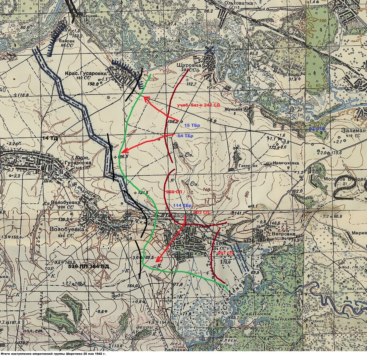 По итогу наступления к 20.00 242-я стрелковая дивизия вышла на рубеж: 300 метров восточнее Красной Гусаровки – высота 136,9 в 2,3 км восточнее Гусаровки – высота 134,5 к северу от Волобуевки – высота 169,5 – Ветровка. Полностью высоту 169,5 удалось занять только к утру 26 мая. Т.к. продвижение частей оказалось минимальным, фактически наступление 25 мая полностью провалилась. К этому надо прибавить, что в ходе наступления пехота 900-го стрелкового полка отстала от танков 15-й и 64-й ТБр и к 23.00 25 мая находилась в 0,2-3 км позади них.