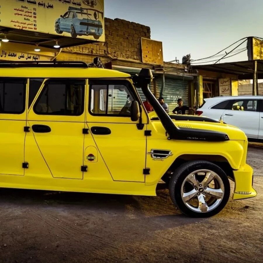 В связи с недостаточным изучением автомобильной культуры, свойственной Ираку, у многих наших соотечественников создается впечатление о спокойном и неинтересном течении жизни на территории этой страны. Хотя многим памятна недавняя война в этом государстве, приведшая к убийству многолетнего правителя Саддама Хуссейна и разрушительным событиям, последовавшим после этого. Тем не менее, в Ираке реализуются некоторые оригинальные проекты, буквально сносящие существующие шаблоны. Попробуем рассказать об этой модели шестидверного УАЗ Хантер, тюнинг которого можно сравнить со спортивным автомобилем. Начнем с внешнего вида. Длина кузова УАЗ увеличена на расстояние, равное одной дверной секции, благодаря чему этот уникальный экземпляр представлен шестью дверьми, хотя с учетом багажной двери общее количество достигло семи. В данном случае речь идет исключительно об одной модификации из тысяч, которым был подвергнут автомобиль. Хантер оборудован самодельным обвесом, оснащенным набором пластиковых