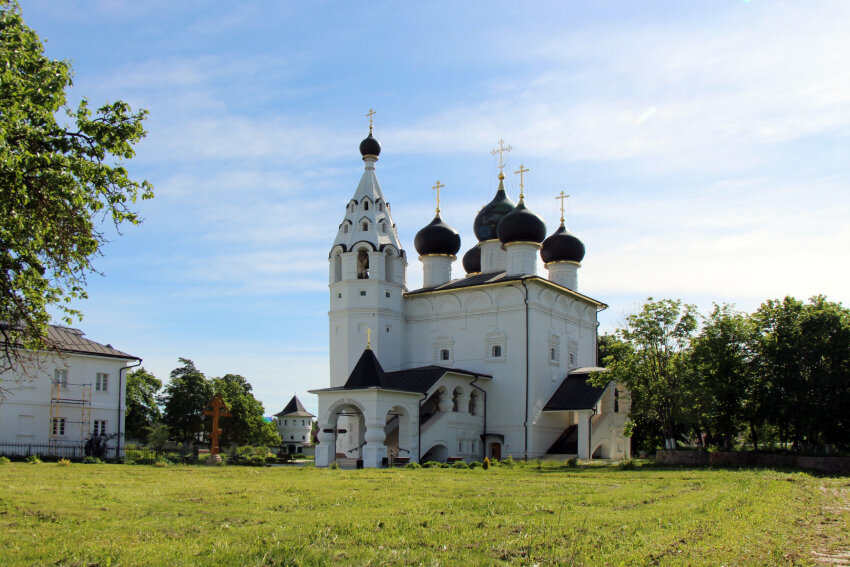 Одно из важных архитектурных начал Вереи - это ее храмы. Представьте себе, в этом небольшом городе, точнее самом маленьком городке Подмосковья, с населением около 5 тысяч жителей аж целых шесть храмов. Прогуляемся от храма к храму, полюбуемся золочеными куполами, ажурными крестами и стройными, устремленными вверх колокольнями. Первым делом свернем к одному из древнейших памятников города - Входоиерусалимской церкви. Когда-то на этом месте находился ныне упраздненный Спасский монастырь. О том, кем он был основан, доподлинно неизвестно. Автомобиль можно оставить на небольшой стоянке возле стен храма. Пойдемте вдоль старых стен на смотровую площадку над рекой Протвой, созданную самой природой. Виды отсюда открываются просто потрясающие. Но не столько на природу мы пришли смотреть, сколько на храм. Бывший собор мужского Спасского монастыря. Он был построен в начале 17 века, и сегодня является старейшим зданием города. Кстати, прогуливаясь мимо стен храма, обратите внимание на большой гран