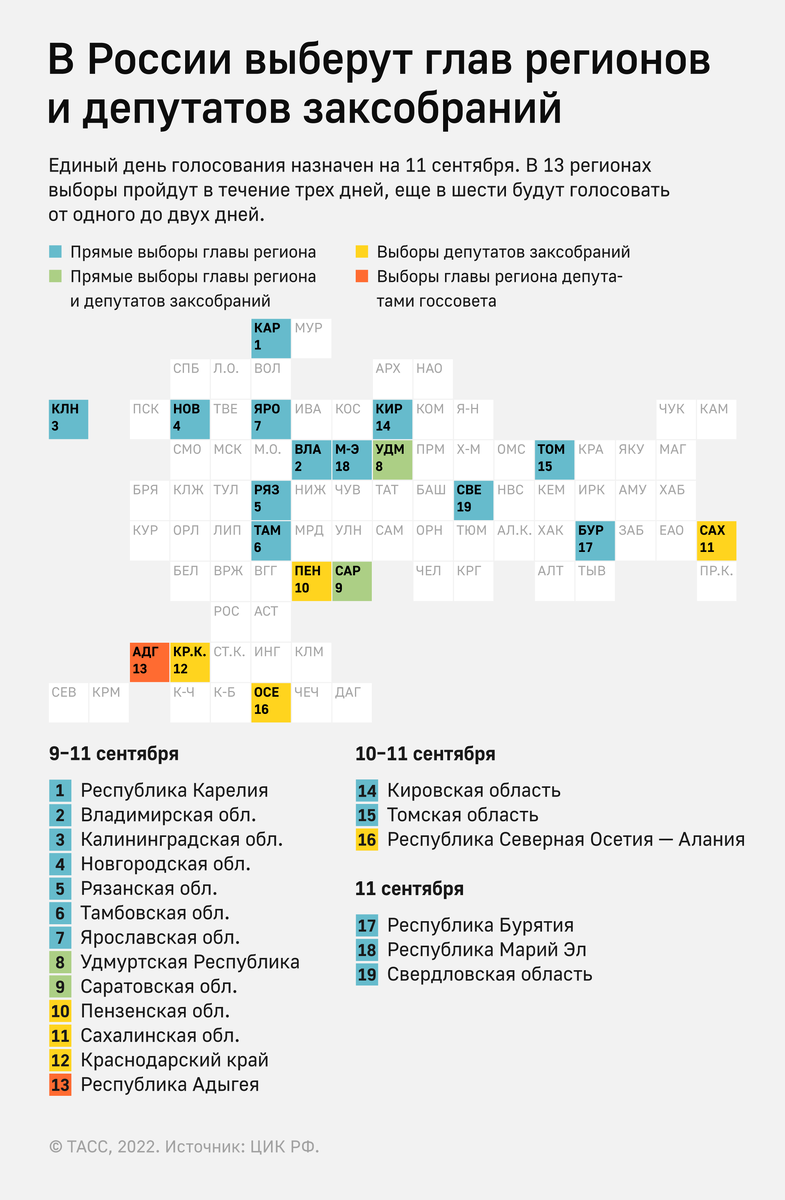 В сентябре в России пройдут выборы 15 высших должностных лиц регионов (14 прямых выборов, в Адыгее — путем голосования в парламенте) и депутатов шести законодательных собраний. Также состоятся муниципальные выборы разных уровней — 12 советов депутатов административных центров субъектов и депутатов органов местного самоуправления, в том числе в Москве. В большинстве субъектов будут голосовать в течение трех дней — с 9 по 11 сентября, в шести регионах выборы пройдут от одного до двух дней. Где выберут глав регионов и депутатов заксобраний, а также сколько дней продлится голосование — смотрите в инфографике ТАСС.