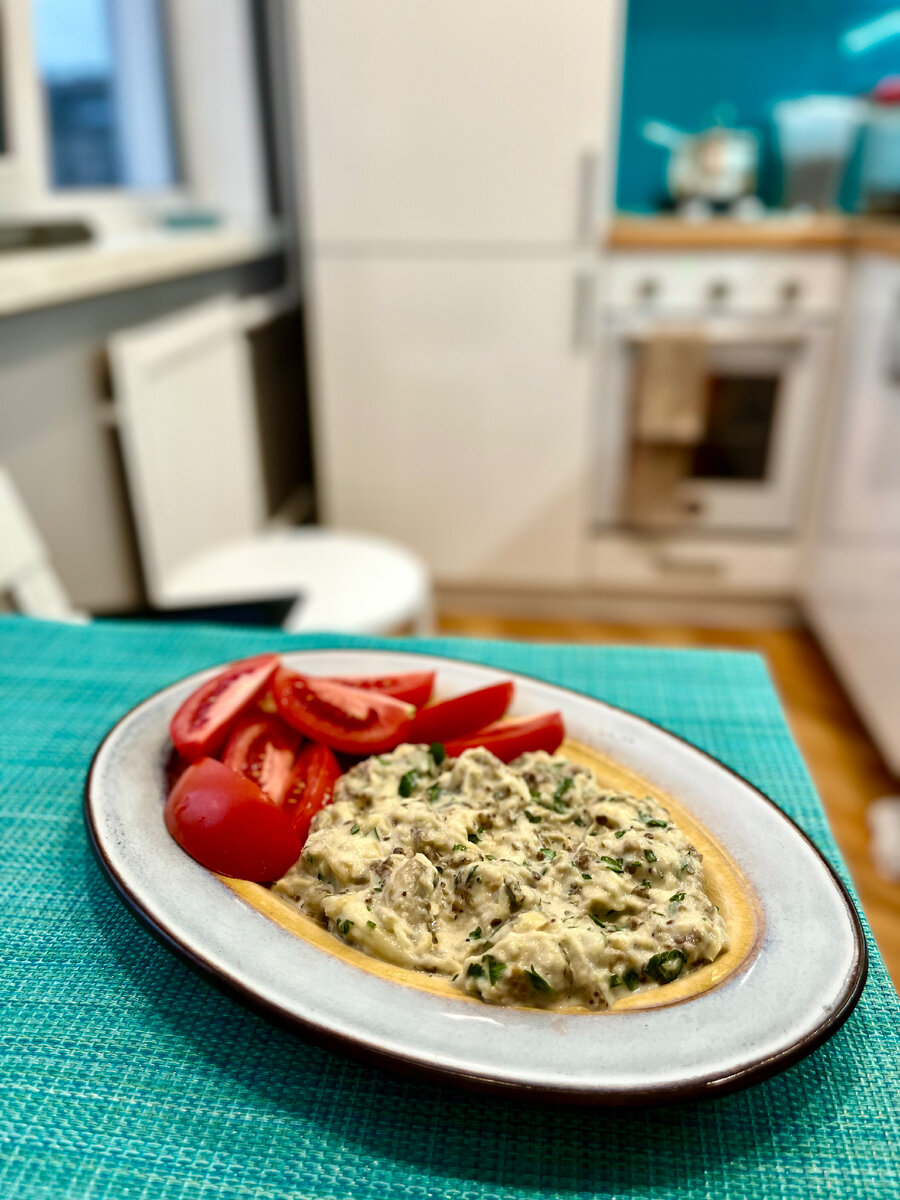 Простецкая бабуйня на манер ближневосточных штук из баклажанов. Вкусно с хлебом, с мясом, с овощами, да хоть с чем. Чо нада: 🍆 один крупный баклажан 🧄 две головки чеснока (головки целые, не зубья) 🥛 греческий йогурт, пара ложек 🍶 оливковое масло 🌿 горсть мелкорубленной петрушки 🧂 соль, чёрный перец Готовится элементарно. Баклажаны разрезаем пополам, чесночины моем (чистить не надо) и отрезаем верхушку (когда чеснок запечется, с отрезанной верхушкой его будет легко выдавить). Баклажаны выкладываем в противень срезом вверх, солим, перчим и сбрызгиваем оливковым маслом. Рядом укладываем чеснок, так же сбрызнутый маслом, посоленный и поперченный, но его завернем в фольгу, а то он сгорит, падлюка. Закидываем в разогретую до 180 градусов духовку минут на 40-50. Достаём, даём подостыть, выдавливаем в миску весь чеснок из шелухи, выколупываем печёную мякоть баклажанов (шкурки нах). И херачим все в неоднородное грубое пюре вилкой. Добавляем йогурт, если надо досаливаем. Печёный че