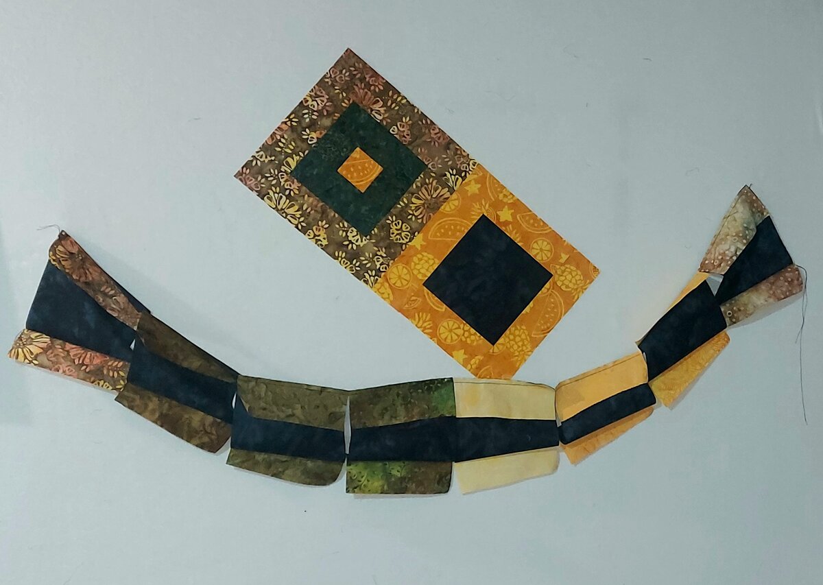 После, разрезала эту "гирлянду" и разутюжила швы. Теперь нужно пришить полосы 26,5×6,5 см с двух других сторон. Я не успела, но приложила полосы и разные листья, что бы посмотреть, как смотрится.