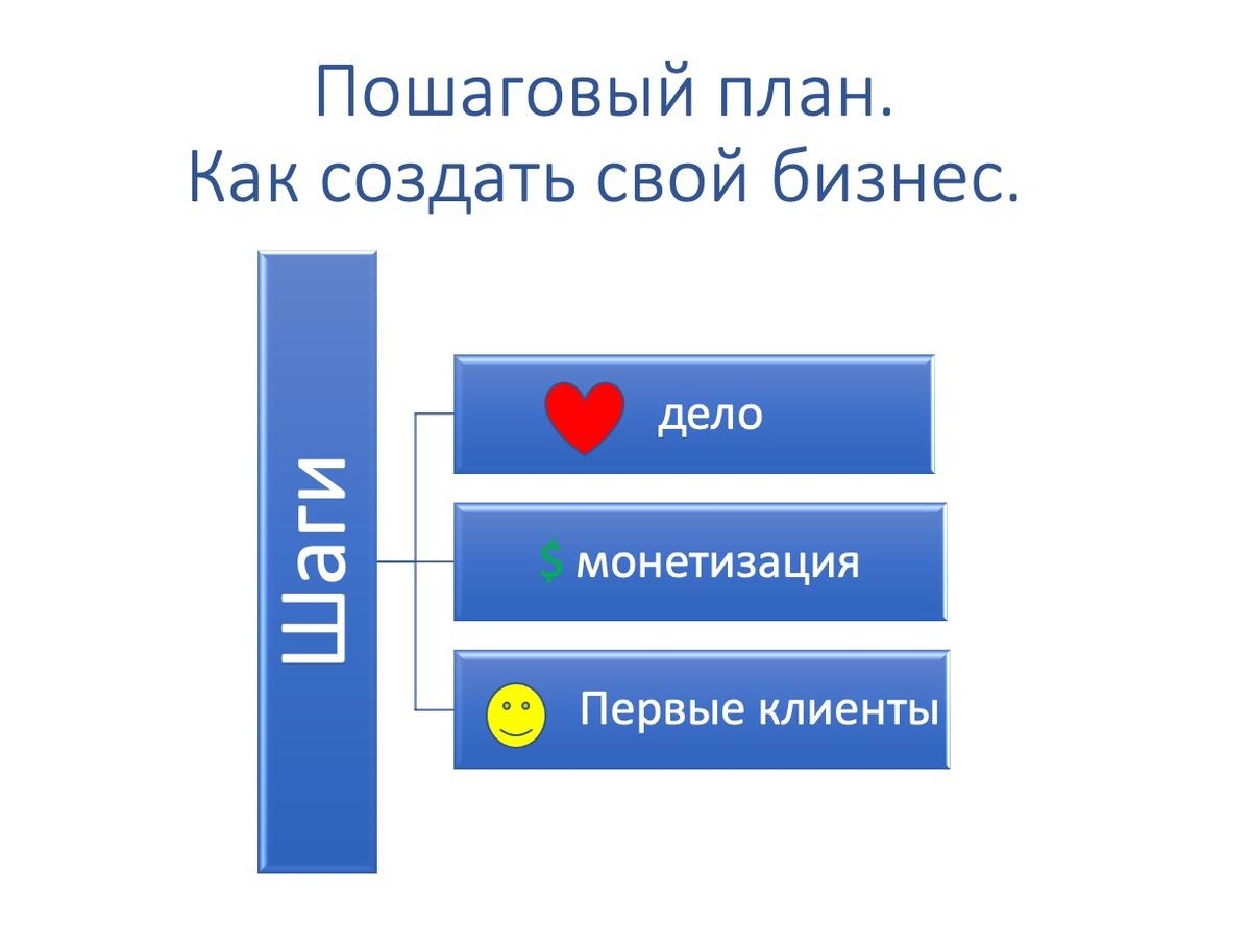 Бизнес - это риски, но это и степень свободы. Уходя в бизнес - Вы открываете перед собой безграничные возможности заработка, возможности быть полезными в этом обществе. В этой статье я расскажу пошаговый план открытия своего бизнеса на мой взгляд. Читайте. Бизнесом может заниматься каждый. Главный принцип при открытии бизнеса - сначала клиенты, потом вложения. Вкладываться можно только тогда, когда уже создан достаточный и гарантированный поток клиентов. Итак, поехали. Шаг 1. Определиться с любимым делом. На этом шаге важно понять, что любите делать и что хорошо получается. В бизнес надо идти только с любимым делом и никак иначе. Иначе энергии на преодоление сложностей не хватит. Подсказка: Легко понять своё любимое дело по обращениям друзей и знакомых, по каким вопросам они консультируются с Вами? И также любимое дело это то дело, которым Вы готовы заниматься даже по ночам и бесплатно. Шаг 2. Разработать схему монетизации. Если торговля, то что продаёте, по какой цене, какая прибыль.
