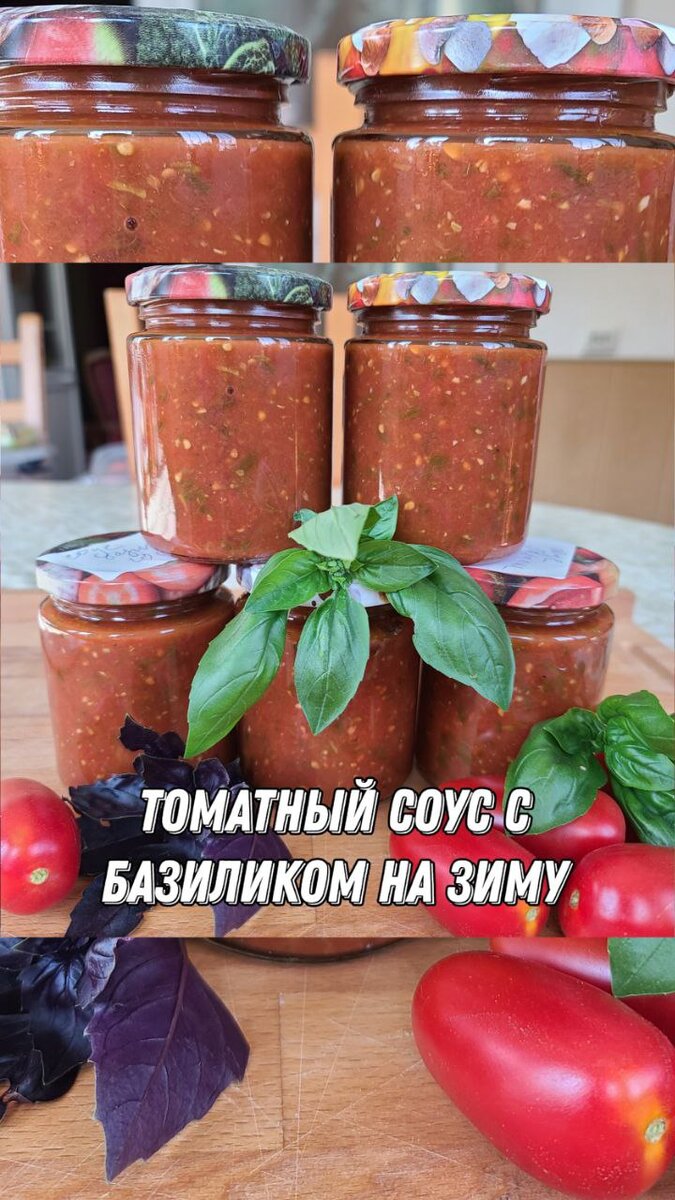 Томатный соус с базиликом без уксуса на зиму Этот соус, была полная импровизация, а получилось ну очень вкусно Томаты примерно 2,5-3кг. Я беру мягкие, которые плохо лежат и те, из которых доставала семена Режем произвольно и отправляем на плиту. Можно к ним добавить болгарский и острый перец. Делали и с ним, и без него, оба варианта получились просто 🔥, но разные по вкусу Пока варятся помидоры, обжариваем 1 луковицу до золотистого цвета, пробиваем блендером 🧄Берём головку чеснока, большой пучок базилика, можно брать и зелёный, и фиолетовый, либо один из Добавляем 1ст.л масла и пробиваем в блендере 🍅Как томаты хорошо пустили сок, откидываем их на дуршлаг, чтобы убрать лишний сок 👉Помидорную массу пробиваем блендером или протираем через сито. Отправляем обратно на плиту. Густоту соуса регулируем соком, который мы слили ✔️Добавляем 1ч.л соли ✔️2-3ст.л сахара ✔️1ч.л молотого перца Все это примерно. Пробуйте и регулируйте по своему вкусу ✔️Добавляем лук, базилик Варим 10 минут