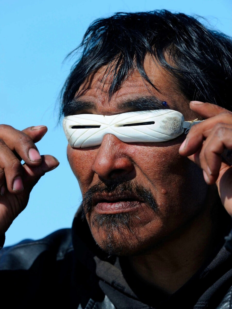 На протяжении тысячелетий юпики и инуиты делали снежные очки из различных материалов (кость, дерево, китовый ус), чтобы защитить глаза от солнца и, что более важно, от солнечного света, отражающегося от арктического снега. Узкие прорези также улучшают остроту зрения. Снежные очки, вероятно, были первым изобретенным носимым корректирующим устройством.