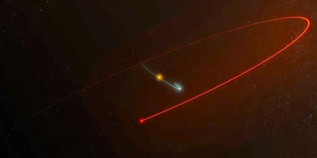 Примерно в 20 световых годах от Земли, что довольно близко по космическим меркам, учёные нашли звезду, являющуюся частью бинарной системы. Иными словами, у этой звезды есть второе парное светило, связанное с ней общей гравитацией. После тщательного анализа данных этой системы исследователям удалось определить циклы вращения звёзд и создать наглядную трёхмерную визуализацию, демонстрирующую орбиты не только обоих светил, но и планеты, блуждающей с этой парой. На представленном видео голубой луч соответствует орбите планеты в бинарной системе, где жёлтая точка в центре — это первая звезда, а красным лучом показана орбита второй. Большая из двух звёзд, которая вращается вокруг экзопланеты, имеет около 44% массы нашего Солнца, а меньшая из них — всего 17%. Они вращаются вокруг друг друга каждые 229 земных лет, в то время как планета внутри системы делает оборот вокруг своей звезды за 284 дня. Сама экзопланета, получившая название GJ 896Ab, выглядит как двойник Юпитера, но с массой примерно