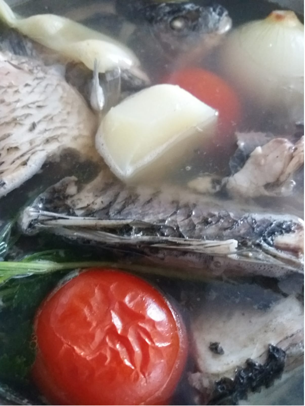 Поместить казан на огонь, залить водой на половину или чуть меньше (все зависит от размера казана и количества ингредиентов), как начнет закипать вода, добавить лук, морковку, подождать минут 5-7 добавить картофель, болгарский перец, помидоры, рыбу, веточки зелени. Так как все ингредиенты опускали в кипящую воду, накипь не образовалась и ее снимать ненужно.