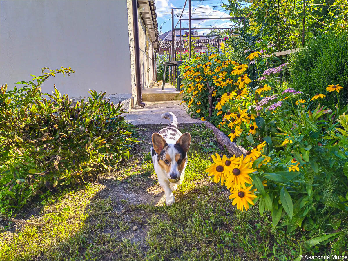 Утром я написал про жуткую вчерашнюю погоду в Крыму. Но сегодня жизнь налаживается. Днём в нашем Старом Крыму было +21. Это уже вполне себе пристойный крымский сентябрь. А море очень тёплое, +26. Это значит, что весь сентябрь можно купаться. А если температура воздуха повысится до привычных для этого времени года +25 градусов, то и в октябре будет купальный сезон. День солнечный. Не только люди радуются, но и животные тоже. Тильда разжилась упавшей грушей и гордая своей добычей ходит за мной. Цветут гибискусы. На грядках зреют помидоры. Среди помидорной ботвы промышляют добычей мух и прочих вредных насекомых ужасного вида пауки. Но они только с виду страшны, а на самом деле вполне безобидны и не опасны для человека. Это паук-оса. Приладился отпугивать своей окраской крупных хищников. Почему-то эти пауки любят жить в помидорных грядках, каждый год там поселяются. Тильда уже разобралась с грушей и теперь пытается закусить чурбачком, выпавшим из дровника. Пришлось проявить диктат и заб