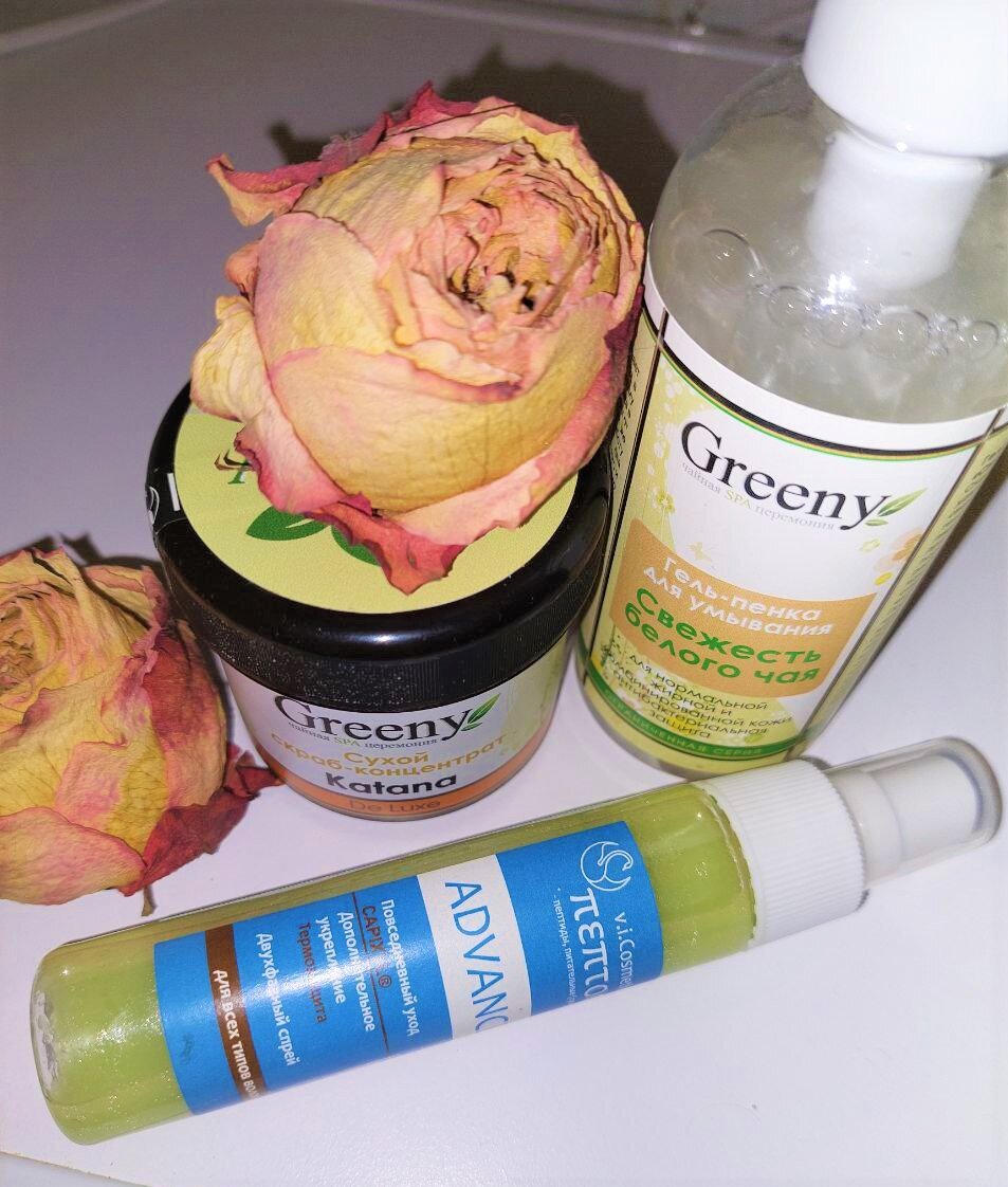 Никогда не слышала об этом бренде, но подруга сагитировала. "Я, - говорит, - уж пару лет у них покупаю всякое уходовое, давай присоединяйся." Ну, а что. Я всегда согласная на изучение нового. Будь то духи, книги или косметика. Глаза на сайте v.i.Cosmetics конечно, разбегаются. Есть несколько линеек для разных типов кожи лица, для рук, для тела. Хочешь - с модными нынче пептидами; необходимы средства с кофе, который, как известно, снимает отёки и тонизирует - да пожалуйста. Аюрведа, янтарь и жемчуга в составе - только выбирай. Для первого раза купила три баночки. Скраб-концентрат с морской солью, сухим молоком, зелёным чаем и лаймом. Вот такой симпатичный цвета сухой травы: Затем умывалку для лица с очень приятным составом. Тысячелистник, ментол, мыльный корень - аромат изумительный, но при этом деликатный, почти что и нет его. Люблю такие средства. Наконец, третьим моим гостем стал укрепляющий спрей для волос. Кроме, собственно, укрепления, - за него отвечают пептиды, отвары ромашки,