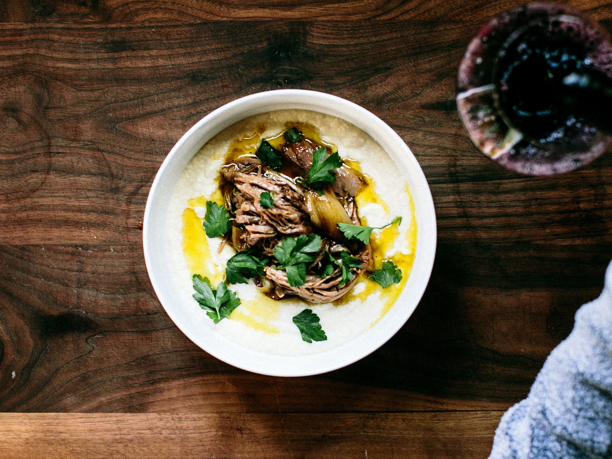 ■ В центре кастрюли создайте кратер и выложите туда свинину. Залейте все сидром так, чтобы мясо было скрыто. Накройте крышкой и поставьте в духовку. Готовьте 5 часов, периодически помешивая.