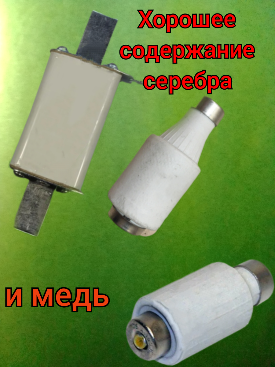Всем привет! Серебро не самый дорогой металл из драгметаллов и последнее время тоже снизился в цене. На сегодня 1 г серебра стоит около 35 рублей. Тогда как в том году она держалась около 50 рублей за 1 г плюс минус. Я думаю серебро будет расти в цене в ближайшие годы, спрос на этом металл будет только расти, солнечные батарей, батареи электромобилей, да и вообще много где в промышленности применяется серебро. Поэтому собирать детали с содержанием серебра, хорошая идея. Или я может не прав, что думаете вы по этому поводу, напишите в комментариях. Предохранители ПН, еще их называют плавкие предохранители. Практически все они содержат серебро, но лучше искать или собирать советского производства, в таких будет больше всего серебра. Плюсом к этому там есть еще и медь. В каком может быть виде серебро, в таких предохранителях видно на фото выше. В них может находиться до 24 г серебра. Вот к примеру ПНБ-1250-400 содержит в себе 13 г серебра, ПНБ5-1250-400 на 400 А содержит 18 г серебра, а в