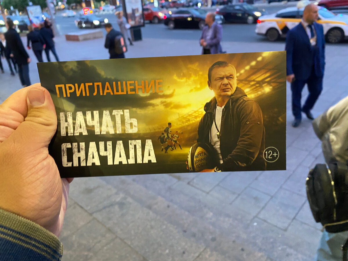 Эта поездка в Москву у меня получилась спонтанной. На днях мне в телеграм написала девушка и попросила проверить почту. Туда мне должно было прийти приглашение на премьерный показ фильма «Начать сначала» с Владимиром Сычевым в главной роли. Заглянул на почту - действительно есть письмо. Тут же покупаю билеты на автобус и уже на следующий день еду в Москву. Премьера фильма должна будет в кинотеатре «Каро Октябрь» на Новом Арбате. Там же неподалёку забронировал номер в отеле, где останусь на ночь. За час до премьеры пришёл к кинотеатру. Народа там уже было много. Получил на входе пригласительный, и отправился внутрь. Зашёл туда, а там на красной дорожке фотографируются и дают интервью актёры фильма. Буквально мимо меня прошёл Владимир Сычев и скрылся с другой стороны красной дорожки. Поднялся на второй этаж, где находился кинозал, в котором и должна была проходить премьера. Людей, желающих посмотреть фильм, там уже было много. А ещё там висел огромный баннер с названием фильма. Возле