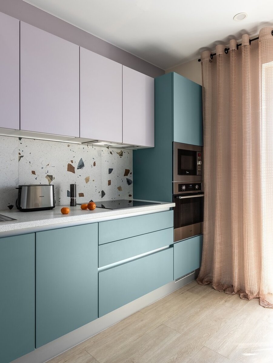 Вкратце Владелица этой квартиры в новостройке Саратова — популярный блогер, которая ведет свой бизнес. Интерьер должен был быть не только комфортным для жизни, но и фотогеничным для записи видеоуроков и трансляций. Дизайнер Мария Михайлова предложила оформить интерьер в стиле мемфис — в его основе лежат геометрические формы и необычные орнаменты. Получилось очень свежо, стильно и модно. Подробности Изначально в квартире предполагались отдельная вытянутая комната, ванная и кухня с балконом. В прихожей выделили гардеробную, а в остальном планировка осталась прежней. В комнате организовали гостиную с большим мягким полукруглым диваном и макияжную зону. На балконе — мини-кабинет с рабочим столом и креслом. Кухня, как и ванная, используется по прямому назначению. Кухонный гарнитур получился компактным. Нижние и верхние шкафы выполнены в разных цветах. Внизу — голубой оттенок, который сочетается с окрашенной стеной в обеденной зоне. Наверху — светлый сиреневый, визуально облегчающий конструк