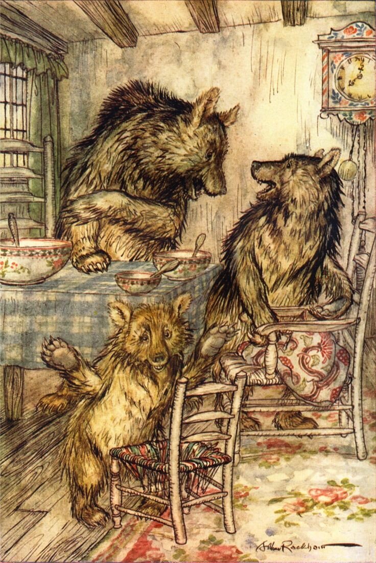 Самое начало сказки здесь а предыдущая часть здесь. Это средний вариант английской сказки, в моем переводе, из собрвния 1872 года и 1890 года. А к тому времени медведи решили, что каша уже остудилась, и вернулись домой завтракать. Глянул большой-здоровенный медведище на свою кашу, видит, а в ней ложка стоит, там её старуха оставила. И взревел медведище своим громким грубым страшным голосом: Кто-то ел мою кашу! Средний медведь тоже глянул на свой горшок, видит, и в его каше ложка стоит. А ложки у медведей были деревянные, а если бы они были серебряные, то на гадкая старуха наверняка бы их украла. И сказал средний медведь своим солидным средним голосом: Кто-то ел мою кашу! А маленький медведь посмотрел в свой горшочек, и видит в горшочке ложка, а каши его и след простыл! И пропищал маленький медведь своим высоким голоском: Кто-то съел мою кашу! Тут медведи догадались, что кто-то забрался к ним в дом и съел всю кашу маленького медведя. И принялись они искать вора по всем углам. И ту