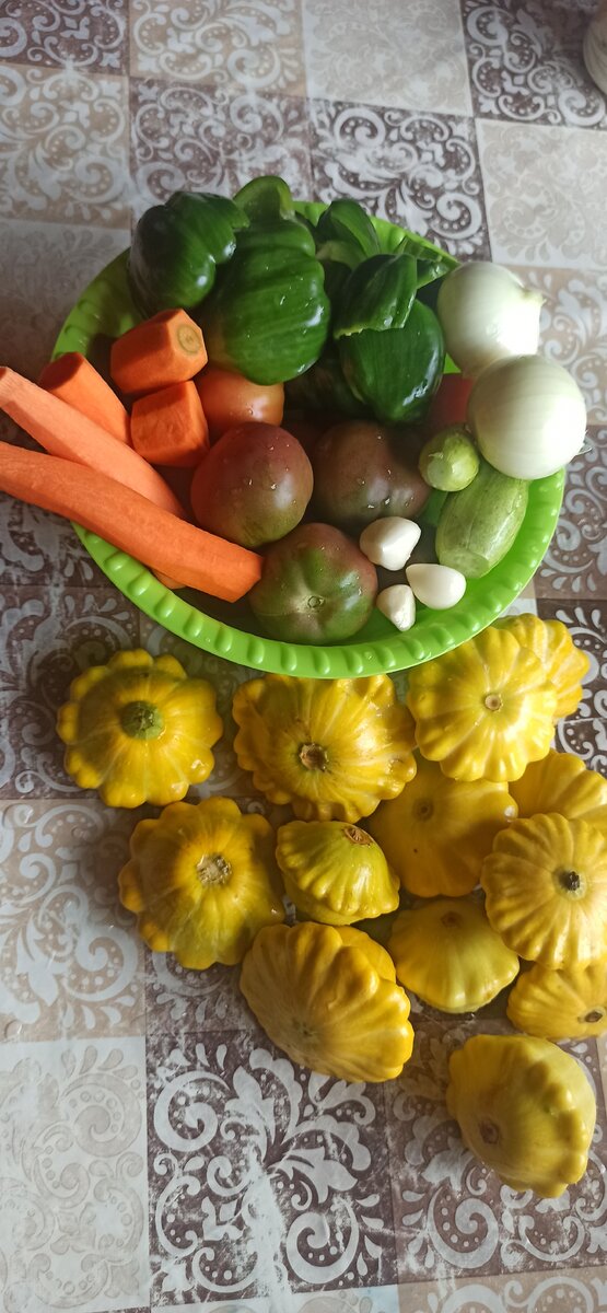 Люблю делать всякие миксы из разных овощей, так сказать огород. Зимой приятно открывать такую баночку, и вкусно, и глаз радует, и на закуску к праздничному столу не стыдно подать. Состав на 3 литровые банки: патиссоны, помидоры, огурцы, перец сладкий-сколько влезет, морковь-2 средние, лук-2 средние, чеснок по зубчику на банку, перец чёрный горошком-по 5 шт.на банку. Овощи мою, что требует чистки-чищу, что нужно порезать - режу (перец маленькими узкими пластиночками, лук и морковку - колечками, патиссоны на 4 части). Банки стерилизую, на дно каждой бросаю чеснок и чёрный перчик. Укладываю всё остальное произвольно, сколько влезет. Заливаю каждую баночку крутым кипятком, прикрываю крышками. Оставляю на 20 мин. Далее сливаю и на этой воде делаю маринад. Маринад на 3 литровые банки: 4 ст. л. сахара, 2 ст. л. соли. Довожу до кипения, кипячу пару минут, выключаю нагрев, добавляю к маринаду 2 ч. л. 70% уксусной эссенции. Разливаю маринад по баночкам, закатываю баночки и кутаю в одеяло,