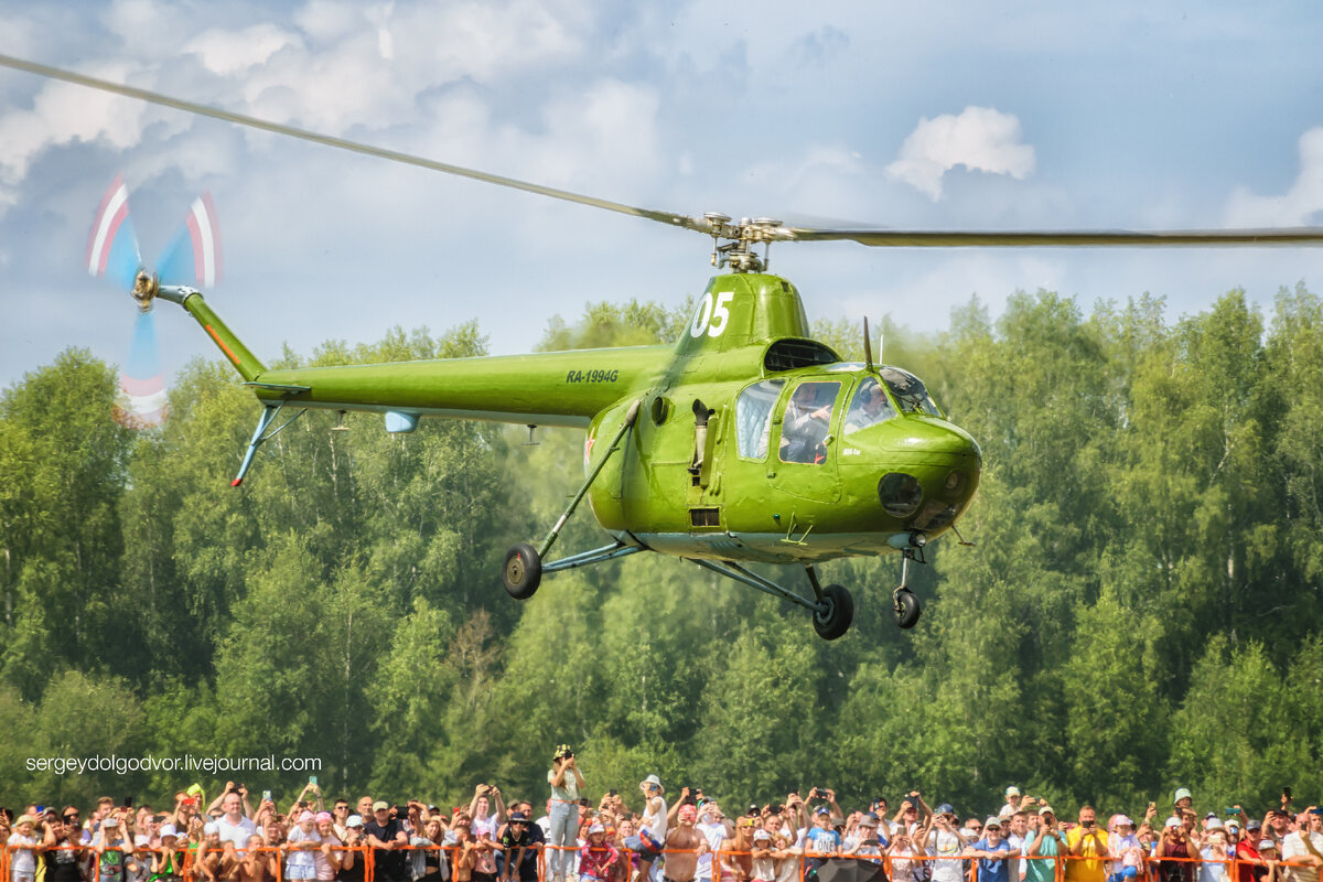 И вновь в небе легенда - единственный в мире летающий Ми-1! Можно считать, что Ми-1 - это первый советский серийный вертолёт. Конкретно данный борт был рождён в 1964 году. Первоначально обозначался как ГМ-1 (Геликоптер Миля-1). Первый полёт Ми-1 совершил в сентябре 1948 года. Серийное производство велось в СССР в 1952 - 1960 г.г., в ПНР в городе Свидник в 1956 - 1965 г.г. Всего было построено 2680 машин.