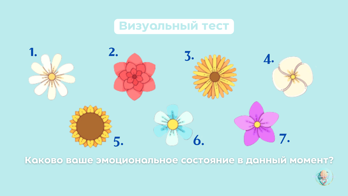 Всегда полезно осознавать свое эмоциональное состояние, чтобы быть в силах выполнять свои повседневные задачи. Потому что повышенное эмоциональное состояние или наоборот, если мы находимся на грустной волне, может навредить нам и нарушить все наши планы. Этот визуальный тест поможет вам определить ваше текущее эмоциональное состояние и предупредит вас о том, чего вам следует остерегаться прямо сейчас. Как пройти тест? Результаты: Цветок № 1. ✔ Сейчас вас одолевает безразличие. Вы потеряли самообладание и не воспринимаете ничего всерьез. Такое поведение может привести к неприятностям. Цветок № 2. ✔ Вы сейчас находитесь в состоянии эйфории. Это чувство полностью погружает вас в самые приятные ощущения. Вы расслаблены и можете не замечать серьезные перемены в своей жизни, но они уже на пороге. Цветок № 3. ✔ Кто-то обидел вас, и вы пытаетесь скрыть эти эмоции. Если вы будете держать это в себе, проблема только усугубится. Вам нужно поговорить с обидчиком и все прояснить. Цветок № 4. ✔ Сей