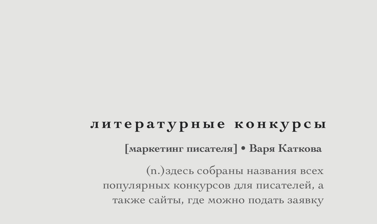 Литературные премии, куда автор может податься самостоятельно без издательства. Выиграть и стать знаменитым. Как это вышло, например, у Кати Манойло. В копилку маркетинг-писателя✅ •Электронная буква – подать заявку ✔️ •Лицей – подать заявку ✔️ •Книгуру – подать заявку ✔️ •Рукопись года – подать заявку ✔️ •Русский детектив – подать заявку ✔️ •Новая детская книга – подать заявку ✔️ •Ежегодный конкурс издательства «Настя и Никита» – подать заявку ✔️ •Премия Крапивина – подать заявку ✔️ •Конкурс им.Сергея Михалкова для авторов произведений для подростков – подать заявку ✔️ Для рассказов: новая фантастика, кубок Брэдбери, пролёт фантазии, чертова дюжина, Уральская Биеннале. Конкурсы от издательств. Например: Астрель-СПб. И конкурсы совместно с площадками самиздата типа ЛитРес и Ридеро. Нужно ли участвовать в конкурсах? Обязательно! Выше написала почему. ✨Больше интересного в телеграмм канале✨ https://t.me/barbarakatkova 📚 Мои книги на Литрес📚 https://www.litres.ru/author/varya-katko