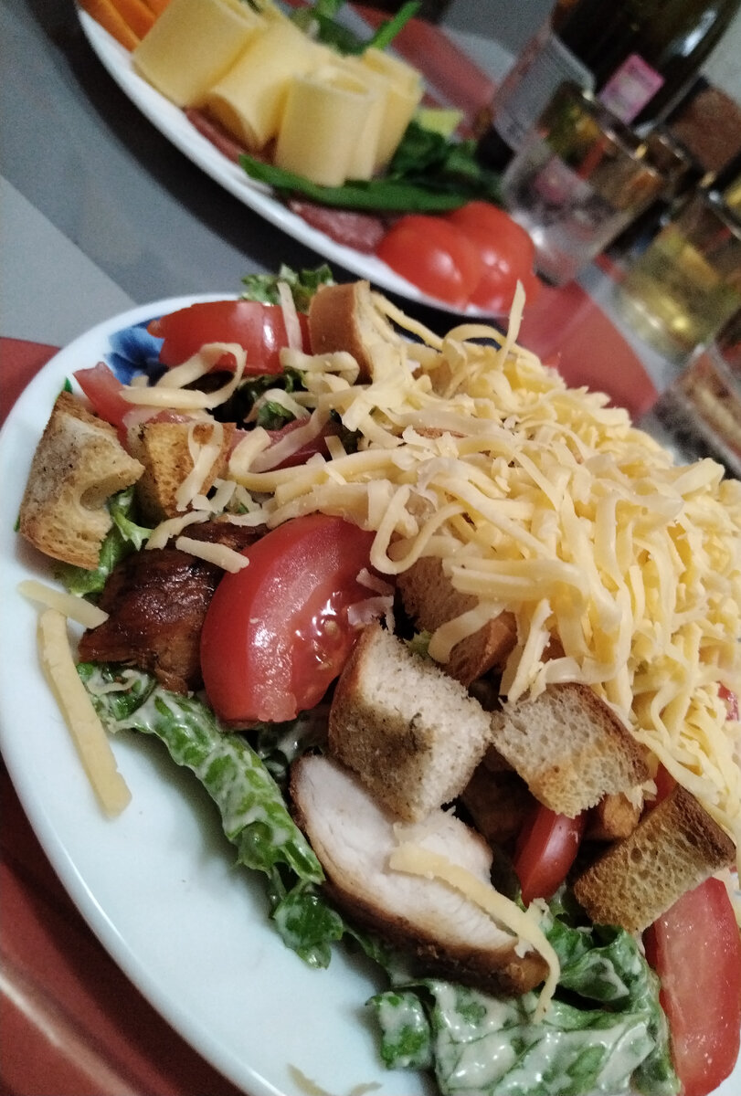 Любимый салат моей семьи-Цезарь. На 6 порций. Куриное филе от одной тушки курицы. Твердый сыр. 3 средних помидорчика. Лист салата-1 пучок. Батон багет для сухариков(или готовые сухарики , очень подходят хрустим-багет со вкусом сыра) Для заправки: Сок половины лимона. Столовая ложка горчицы. Три столовые ложки майонеза. Маринуем куриное филе:я его мариную целиком , потом можно красиво порезать на ломтики. Столовая ложка соевого соуса, 1 зубчик чеснока, приправа для курицы. Хорошо обмазать наше филе и оставить на пару часов. Тем временем порезать батон-багет на кубики подходящие вам по размеру😊, развести соль со столовой ложкой подсолнечного масла и столовой ложкой воды, сбрызнуть будущие сухарики.Высыпать на противень и поставить в духовку доведя до хрустящего состояния. Соус:выдавить сок половины лимона, смешать с майонезом и горчицей. Вымыть лист салата, просушить. Маринованное куриное филе обжарить на сковороде до готовности.Порезать на красивые пластинки. Натереть твердый сыр на ме