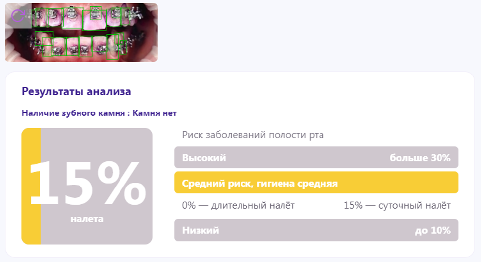 После анализа фотопротокола, программа DIANA подсчитала количество налета у пациента: суточный налет покрывает 15% поверхности зубов. Пациент носит брекеты, следовательно, основная масса налета сосредоточена вокруг несъемной конструкции. Такое количество налета по подсчетам DIANA соответствует среднему уровню гигиены и среднему риску развития заболеваний полости рта. Многие врачи-ортодонты часто сталкиваются с проблемой очищения зубов у пациентов, носящих брекеты. Брекеты – несъемная конструкция, с которой чистить зубы достаточно затруднительно, поэтому пациенты должны уделять больше внимания этому процессу во избежание возникновения кариеса и его осложнений. Развитие заболеваний твердых тканей зуба может поставить под угрозу непрерывность процесса лечения. Пациентам с брекетами необходимо запастись специальными предметами гигиены. Зубная щетка должна быть с малым размером головки для тщательного очищения всех поверхностей. Также нужно обзавестись межзубными ершиками и монопучковой щ