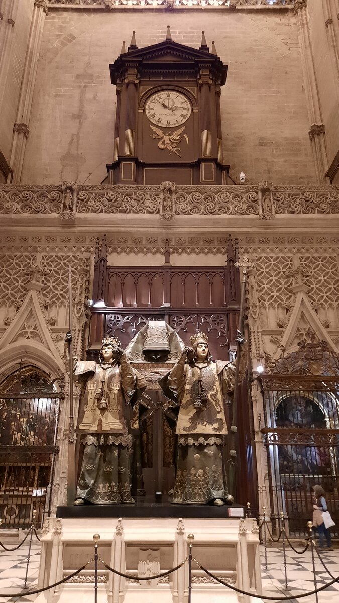 Несмотря на это, с 1890 года, возле главного входа в Кафедральный собор Севильи, расположен большой погребальный монумент Христофору Колумбу, в котором предположительно хранятся останки известного мореплавателя. Саркофаг с телом Колумба держится четырьмя статуями, представляющими королевства Арагон, Кастилию, Леон и Наварру. В руках одного из королей копье, пронизывающее плод граната, символизирующий последний арабский эмират в Испании - Гранаду.