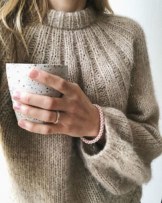 Свитер вяжется в 2 нити, взяв в меру толстую пряжу с альпакой и тонкий мохер. В итоге свитер получается связанным из толстой пряжи, но не тяжелым за счет мохера.