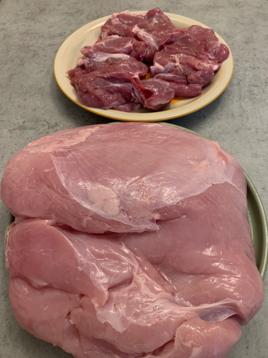 Очень удобно в выходные сделать заготовки на рабочую неделю и по вечерам, приходя домой, не стоять на кухне до утра - а если купить побольше мяса, то может и на целый месяц хватить. И ещё один плюс! Делать большие закупки мяса раз в месяц или в пару недель - получается выгодно. Не забудь поставить сердечко и оставить комментарий, если понравилась статья или она была тебе чем-то полезна🙃 В этот раз у меня 3 кг. филе грудки индейки и 1 кг. филе бедра. Из этого количества мяса у меня получилось 5 килограмм 200 грамм заготовок. Для начала я сделала нарезку из филе груди: 1) Стейки 2) Гуляш 3) Стейки с томатом и тёртым сыром 4) Нагетсы (Для стейков с сыром и нагетсов я сначала замариновала филе в смеси приправ, соевом соусе, горчице и остром перце). Далее прокрутила фарш из оставшейся груди с добавлением половины бедра. Из фарша у меня получились: 1) Фаршированные перцы 2) "Гнёзда" с грибами и сыром Фарш, жареные шампиньоны и тёртый сулугуни. 3) Фрикадельки из того, что осталось :)
