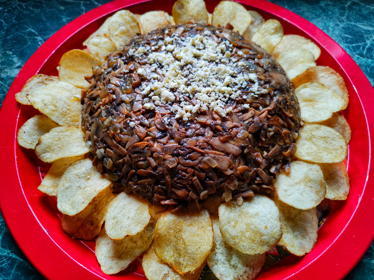 Обычно в салате "Подсолнух" для декора используется маслины в большом количестве. Но далеко не все их любят. Специально для "нелюбителей" маслин я готовлю такой вариант салата - простой и очень сытный, так как в нём много белковых компонентов. Надеюсь, и вам он понравится: - куриная грудка среднего размера ( у меня была от курицы весом 1,6 кг) - шампиньоны 400 г - лук 1-2 шт. - чеснок 2 зубчика - яйца 6 шт. небольших - сыр 100 г - соль, чёрный молотый перец по вкусу - масло растительное 2 ст.ложки - майонез 4 ст.ложки с горкой - лавровый лист 1 шт. - перец горошком 5-6 шт. - чипсы картофельные не рифлёные для украшения (у меня со вкусом грибов) Для начала, нужно сварить грудку. Доводим до кипения примерно 1 л воды, кладём по вкусу соль и приправы (у меня лавровый лист, перец горошком, чеснок 2 зубчика). Опускаем грудку и после повторного закипания варим на слабом огне 15 минут. Кожу я снимала уже после варки, но можно снять и сразу. Огонь выключаем, крышку закрываем плотно и оставляем