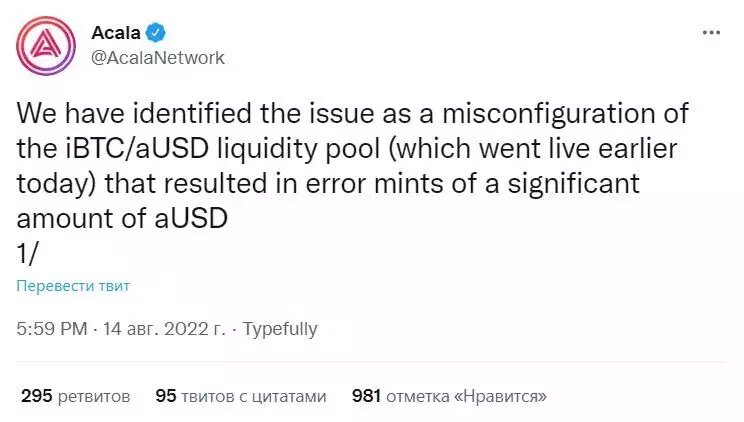 Итак, в ночь с 15 на 16 августа на платформу была совершена кибер-атака, в ходе которой анонимный злоумышленник выпустил 1,2 миллиарда токенов aUSD, не обеспеченные долговыми активами. Хакер воспользовались неправильной конфигурацией протокола Honzon и пула ликвидности iBTC/aUSD. Логично, что при эмиссии такого большого количества необеспеченных токенов монета проекта обесценилась практически до нуля.
