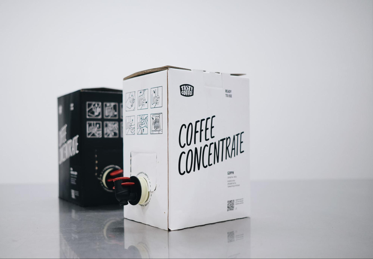 Изначально в планах было иметь два продукта на основе нескольких разновидностей кофе. Мы хотели производить концентрат в белых коробках на основе смеси зерен из Бразилии и Эфиопии, обжаренных для классических молочных и авторских напитков. А также в черных — более яркий кофе на основе микролотов более светлой обжарки с меньшим TDS. Такой концентрат можно использовать как основу для черного кофе, которую достаточно просто развести горячей или холодной водой. Он подошел бы для американо или эспрессо-тоника.