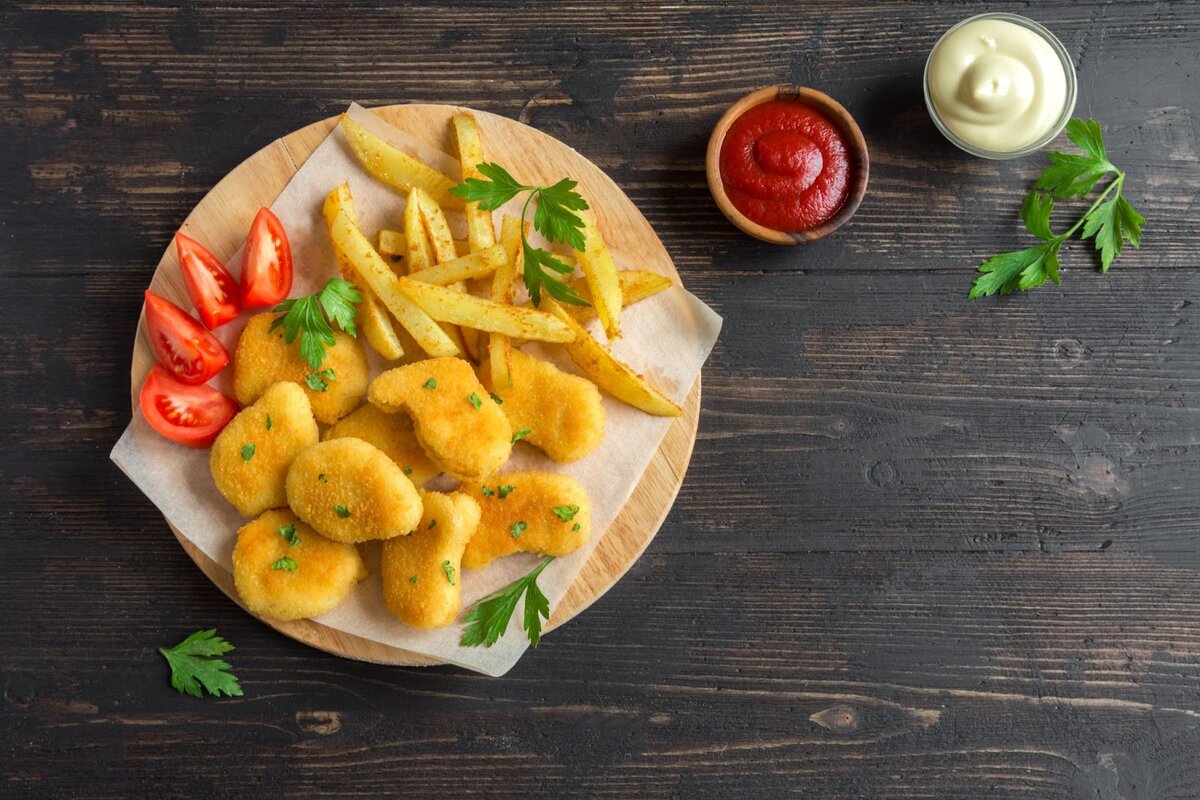 Как быть, если ребенку не нравятся школьные обеды? Приготовить что-то, от чего маленький привереда точно не сможет отказаться. Сегодня мы поделимся с вами рецептом домашних наггетсов! Главная «фишка» блюда — хрустящая панировка, в составе которой есть секретный ингредиент, отвечающий за ее золотистый цвет. Кстати, вы знали, что наггетсы были придуманы ученым? В 1950-х годах профессор Ричард Бейкер (фамилия в переводе с английского означает «пекарь», но это чистое совпадение) взял на себя непростую задачу. Ему хотелось придумать, как жарить готовую замороженную курицу, чтобы она сохраняла хрустящую корочку. После долгих экспериментов Бейкер решил обвалять куриное филе в панировке — и получил наггетсы! Хрустящие наггетсы «Курочка в шубке» Что понадобится? Как готовить? Шаг 1 Слово «наггетсы» происходит от английского Nugget, что означает «самородок». Ведь кусочки обжаренной курочки действительно похожи на маленькие золотые самородки! В нашем рецепте за особенный золотистый цвет отвечает