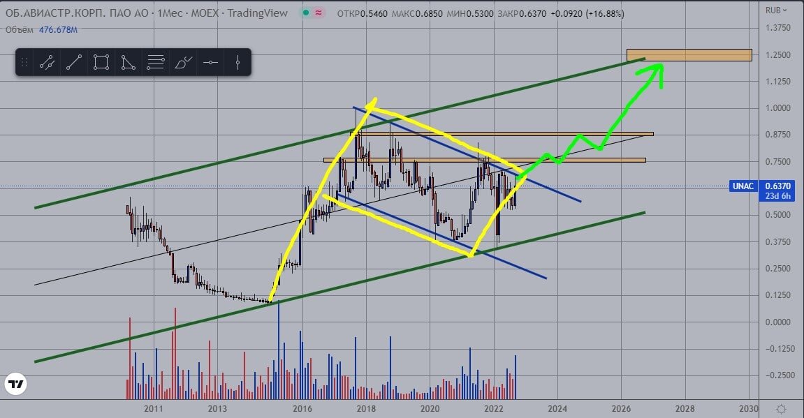 Обещанное видение по Объединенной Авиастроительной Корпорации (#UNAC). ☝️Все сказанное в предыдущем посте про Аэрофлот в не меньшей степени справедливо и для ОАК. Более того, если верить данным, капитализация компании равна 310 млрд. А заказ прилетел на трюль! Чувствуете потенциал?! На графике, как обычно, вижу модель, которая говорила о росте до появления новости. В данном случае это Флаг (для простоты восприятия обвел желтым). Как только цена пробьет вверх его границы, это будет мощным бычьим сигналом. К тому же есть и другие аспекты указывающие на рост: цена в зеленом долгосрочном растущем канале + на последней Monthly-свече произошел скачок объемов. Цели роста вижу такие: 0,75; 0,875 и 1,25 🚀 #UNAC