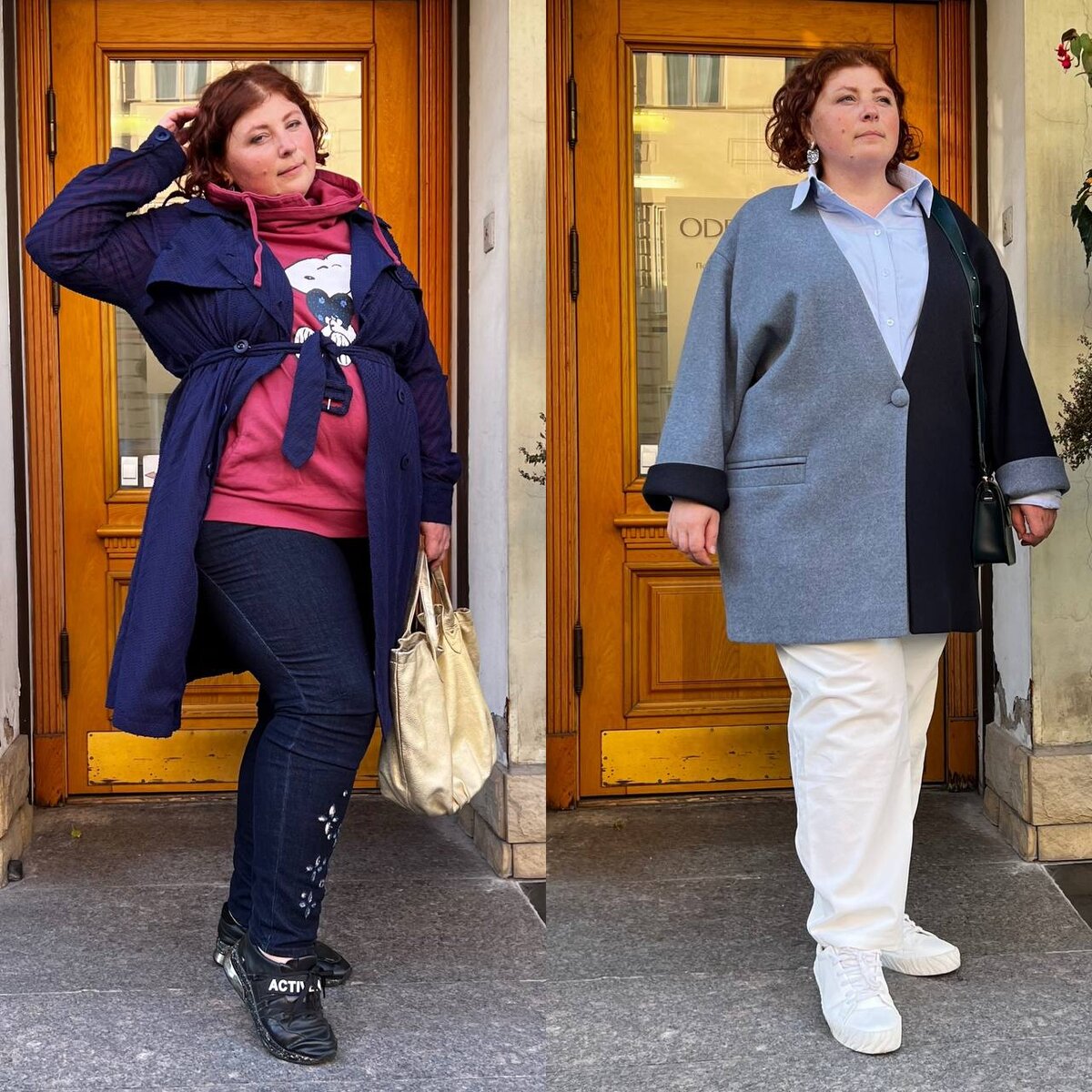Сложно представить, как изделия могут сильно менять нашу внешность. На фото: Елена - стилист-консультант бренда ODEVAIWEAR. Елена - обладательница фигуры "груша" и российского размера 60. Елена принесла свои старые вещи, которые когда-то были популярными (на фото слева) и надела их специально для наглядного примера: Всего за минуту стильная дорогая и элегантная леди может превратиться в заурядную, не имеющую вкуса женщину, которая пытается "молодиться" за счет молодежных элементов одежды: рисунков персонажей из мультиков и страз в виде цветочков. На фото слева: Вывод: то, что было когда-то популярным уже изжило себя. Нужны преображения и новые актуальные фасоны! На фото справа: Елена надела свою актуальную одежду: Белые джинсы, классическую рубашку мужского кроя и жакет-пальто в английском стиле. Видна ли разница между образом слева и справа? Какой вариант вам нравится больше всего? Делитесь в комментариях под этой статьей!