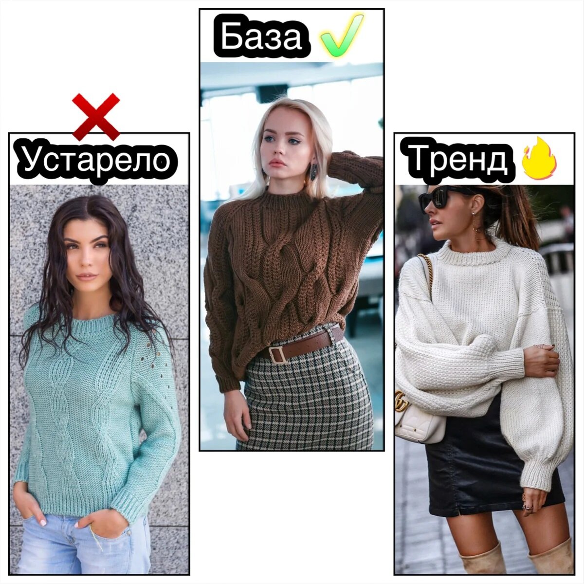 Правила этикета предписывают никогда не спрашивать женщину о возрасте, но некоторые дамы, словно специально добавляют себе лет, выбирая устаревшую одежду. Эвелина Хромченко рекомендует следить за модными трендами, но не копировать их слепо. Выбирать нужно только то, что подходит именно вам. Вот несколько советов от модного стилиста. Джемпер Вряд ли хотя бы один осенний гардероб обойдется без джемпера. Эта одежда универсальна, практична и удобна. Посмотрите на джемперы, которые есть у вас в гардеробе. Короткие модели, которые обтягивают тело, безнадежно устарели. Если вам жалко выбросить подобную вещь, то используйте её для создания многослойных ансамблей, надевая первым слоем. Актуальный вариант – свободные джемперы. Цвет и узор вязки могут быть любыми, главное, чтобы трикотаж был не слишком тонким. Прямой свободный джемпер можно отнести к базе, а если хотите современную трендовую вещь, выбирайте модель с пышными рукавами. Примеры образов: Кардиган К числу устаревших относятся кардига