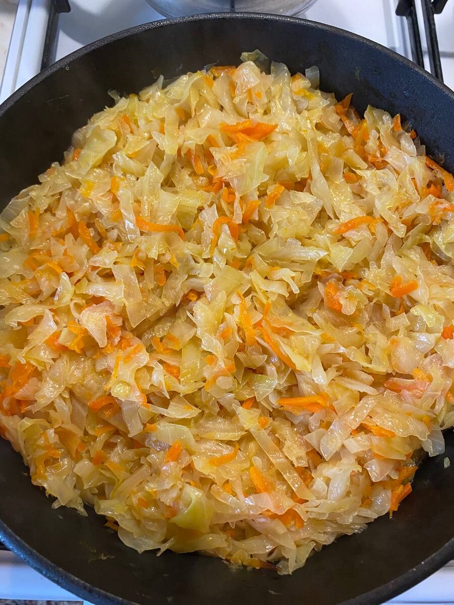 Приготовление пирога начинаем с начинки. Лук с морковкой обжариваем, затем добавляем капусту, тушим до готовности, даём остыть.