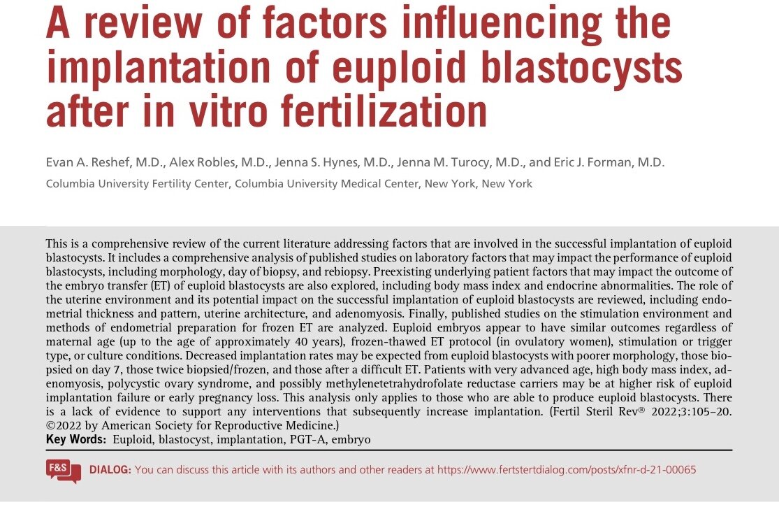 В майском номере журнала Fertility Sterility был опубликован большой обзор факторов, влияющих на имплантацию эуплоидных эмбрионов после экстракорпорального оплодотворения.