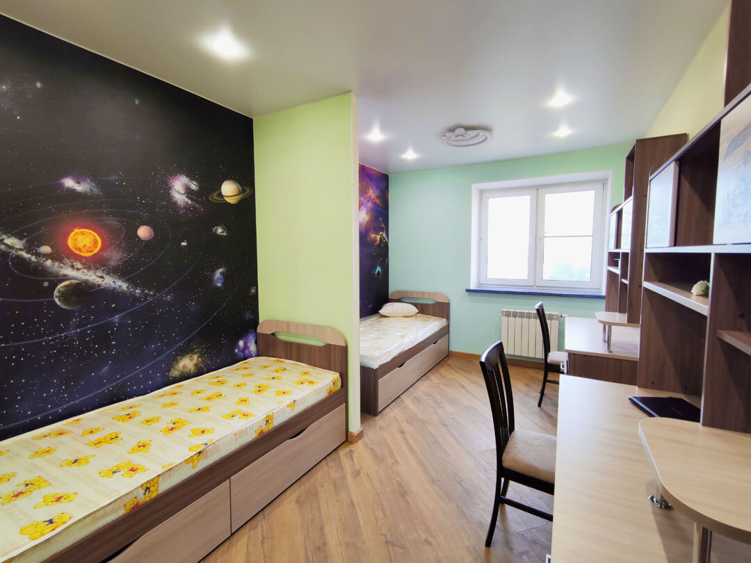 Своя комната необходима каждому ребенку — здесь он будет играть, учиться, отдыхать. Нельзя оставлять ребенка без территории, на которой он сможет выплеснуть энергию — так вы сохраните покой и порядок в остальных комнатах. Детская комната должна быть большой, особенно если у вас не один ребенок, и грамотно разделенной на зоны для сна, игр и обучения.